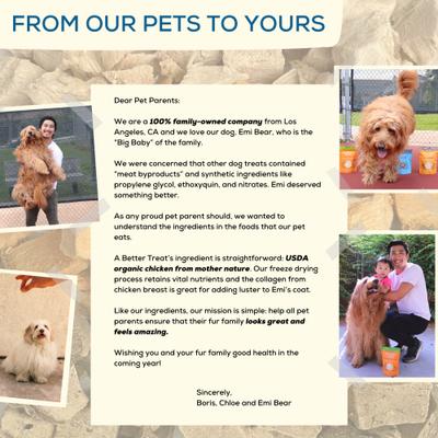 A Better Treat Organic Chicken Breast Freeze-Dried Dog & Cat Treats are an organic single-ingredient treat, perfect for your beloved furbabies. These treats are made with organic, human-grade ingredients to ensure the cleanest and most stomach-friendly options for your furry friends. Organic chicken breast treats are not only delicious but also packed with protein and perfect for both kitties and pups with allergies, sensitive stomachs, diabetes, or specific dietary requirements. Plus, they are grain-free, gluten-free, and low in fat, making them a healthy choice for your four-legged family member’s diet.