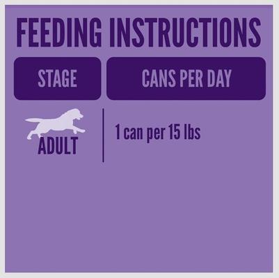 ADULT: FEED 1 CAN PER 15 LBS. OF BODY WEIGHT PER DAY. AMOUNT OF FOOD YOUR DOG REQUIRES WILL DEPEND ON ACTIVITY, AGE, ENVIRONMENT, AND BREED. FEED AT ROOM TEMPERATURE AND REFRIGERATE UNUSED PORTION. ALWAYS PROVIDE ACCESS TO CLEAN FRESH WATER.