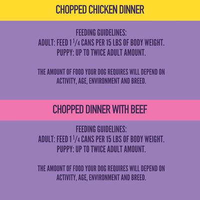 Chopped Chicken Dinner: Adult: Feed 1¼ cans per 15 lbs. of body weight per day.