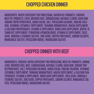 Chopped Chicken Dinner: Water Sufficient for Processing, Chicken By-Products, Chicken, Meat By-Products, Liver, Brewers Rice, Carrageenan, Natural Flavor, Guar Gum, Sodium Tripolyphosphate, Added Color, Salt, Potassium Chloride, Choline Chloride, Vitamins (Vitamin E Supplement, Thiamine Mononitrate, Niacin Supplement, D-Calcium Pantothenate, Vitamin A Supplement, Riboflavin Supplement, Biotin, Vitamin B12 Supplement, Pyridoxine Hydrochloride, Vitamin D3 Supplement, Folic Acid), Minerals (Ferrous Sulfate, Zinc Oxide, Copper Proteinate, Sodium Selenite, Manganese Sulfate, Potassium Iodide), Magnesium Sulfate.