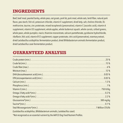 Beef, Beef Meal, Pearled Barley, Whole Peas, Oat Groats, Pork Fat, Pork Meal, Whole Oats, Lentil Fiber, Natural Pork Flavor, Pea Starch, Fish Oil, Potassium Chloride, Vitamin E Supplement, Dried Kelp, Salt, Choline Chloride, DL-Methionine, Taurine, Zinc Proteinate, Mixed Tocopherols (Preservative), Vitamin C (Ascorbic Acid), Vitamin A Supplement, Vitamin D3 Supplement, Whole Apples, Whole Butternut Squash, Whole Carrots, Collard Greens, Whole Pears, Whole Pumpkin, Niacin, Thiamine Mononitrate, Calcium Pantothenate, Pyridoxine Hydrochloride, Riboflavin, Folic Acid, Vitamin B12 Supplement, Copper Proteinate, Citric Acid (Preservative), Rosemary Extract, Dried Lactobacillus Acidophilus Fermentation Product, Dried Bifidobacterium Animalis Fermentation Product, Dried Lactobacillus Casei Fermentation Product.