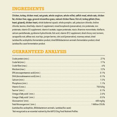 Chicken, Turkey, Chicken Meal, Oat Groats, Whole Sorghum, Whole Millet, Catfish Meal, Whole Oats, Chicken Fat, Chicken Liver, Eggs, Ground Miscanthus Grass, Natural Chicken Flavor, Fish Oil, Turkey Giblets (Liver, Heart, Gizzard), Chicken Heart, Whole Butternut Squash, Whole Pumpkin, Salt, Potassium Chloride, Choline Chloride, Taurine, Dried Kelp, Vitamin E Supplement, Mixed Tocopherols (Preservative), Zinc Proteinate, Iron Proteinate, Vitamin D3 Supplement, Vitamin A Acetate, Copper Proteinate, Niacin, Thiamine Mononitrate, Riboflavin, Calcium Pantothenate, Pyridoxine Hydrochloride, Folic Acid, Vitamin B12 Supplement, Dried Chicory Root, Turmeric, Sarsaparilla Root, Althea Root, Rose Hips, Juniper Berries, Citric Acid (Preservative), Rosemary Extract, Dried Lactobacillus Acidophilus Fermentation Product, Dried Bifidobacterium Animalis Fermentation Product, Dried Lactobacillus Casei Fermentation Product.