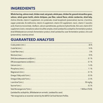 Whole Herring, Salmon Meal, Chicken Meal, Oat Groats, Whole Peas, Chicken Fat, Ground Miscanthus Grass, Salmon, Whole Green Lentils, Whole Chickpeas, Pea Fiber, Natural Flavor, Whole Cranberries, Dried Kelp, Choline Chloride, Vitamin E Supplement, Zinc Proteinate, Mixed Tocopherols (Preservative), Taurine, L-Carnitine, Copper Proteinate, Dl-Methionine, Vitamin A Supplement, Vitamin D3 Supplement, Niacin, Vitamin C (Ascorbic Acid), Thiamine Mononitrate, Riboflavin, Calcium Pantothenate, Pyridoxine Hydrochloride, Folic Acid, Vitamin B12 Supplement, Biotin, Menadione Sodium Bisulfite Complex, Dried Lactobacillus Acidophilus Fermentation Product, Dried Bifidobacterium Animalis Fermentation Product, Dried Lactobacillus Casei Fermentation Product, Citric Acid (Preservative), Rosemary Extract.