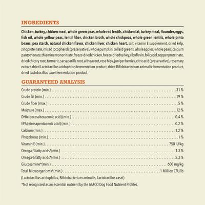 Chicken, Turkey, Chicken Meal, Whole Green Peas, Whole Red Lentils, Chicken Fat, Turkey Meal, Flounder, Eggs, Fish Oil, Whole Yellow Peas, Lentil Fiber, Chicken Broth, Whole Chickpeas, Whole Green Lentils, Whole Pinto Beans, Pea Starch, Natural Chicken Flavor, Chicken Liver, Chicken Heart, Salt, Vitamin E Supplement, Dried Kelp, Zinc Proteinate, Mixed Tocopherols (Preservative), Whole Pumpkin, Collard Greens, Whole Apples, Whole Pears, Calcium Pantothenate, Thiamine Mononitrate, Freeze-Dried Chicken, Freeze-Dried Turkey, Riboflavin, Folic Acid, Copper Proteinate, Dried Chicory Root, Turmeric, Sarsaparilla Root, Althea Root, Rose Hips, Juniper Berries, Citric Acid (Preservative), Rosemary Extract, Dried Lactobacillus Acidophilus Fermentation Product, Dried Bifidobacterium Animalis Fermentation Product, Dried Lactobacillus Casei Fermentation Product.