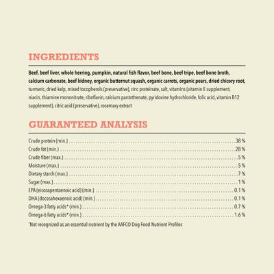 Carne de res, hígado de res, caballa entera, calabaza, sabor natural a pescado, hueso de res, callos de res, riñón de res, caldo de hueso de res, calabaza butternut orgánica, zanahorias orgánicas, pera orgánica, sal, raíz de achicoria deshidratada, cúrcuma, algas deshidratadas, tocoferoles mixtos (conservante), proteinato de zinc, vitaminas (suplemento de vitamina E, niacina, mononitrato de tiamina, riboflavina, pantotenato de calcio, clorhidrato de piridoxina, ácido fólico, suplemento de vitamina B12), ácido cítrico (conservante), extracto de romero