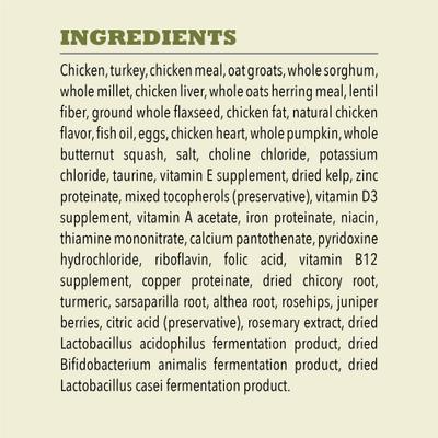 Chicken, Turkey, Chicken Meal, Oat Groats, Whole Sorghum, Whole Millet, Chicken Liver, Whole OatsHerring Meal, Lentil Fiber, Ground Whole Flaxseed, Chicken Fat, Natural Chicken Flavor, Fish Oil, Eggs,Chicken Heart, Whole Pumpkin, Whole Butternut Squash, Salt, Choline Chloride, Potassium Chloride,Taurine, Vitamin E Supplement, Dried Kelp, Zinc Proteinate, Mixed Tocopherols (Preservative), VitaminD3 Supplement, Vitamin A Acetate, Iron Proteinate, Niacin, Thiamine Mononitrate, CalciumPantothenate, Pyridoxine Hydrochloride, Riboflavin, Folic Acid, Vitamin B12 Supplement, CopperProteinate, Dried Chicory Root, Turmeric, Sarsaparilla Root, Althea Root, Rosehips, Juniper Berries, CitricAcid (Preservative), Rosemary Extract, Dried Lactobacillus Acidophilus Fermentation Product, DriedBifidobacterium Animalis Fermentation Product, Dried Lactobacillus Casei Fermentation Product