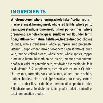Whole Mackerel, Whole Herring, Whole Hake, Acadian Redfish, Mackerel Meal, Herring Meal, Whole Red Lentils, Whole Pinto Beans, Pea Starch, Whitefish Meal, Pollock Oil, Pollock Meal, Whole Green Lentils, Whole Chickpeas, Sunflower Oil, Flounder, Natural Fish Flavor, Lentil Fiber, Safflower Oil, Freeze-Dried Cod Liver, Choline Chloride, Whole Cranberries, Whole Pumpkin, Collard Greens, Carrots, Apples, Zinc Proteinate, Vitamin E Supplement, Dried Kelp, Taurine, Copper Proteinate, Niacin, Thiamine Mononitrate, Riboflavin, Calcium Pantothenate, Pyridoxine Hydrochloride, Folic Acid, Vitamin B12 Supplement, Biotin, L-Carnitine, Dl-Methionine, Ascorbic Acid (Vitamin C), Chicory Root, Turmeric, Sarsaparilla Root, Althea Root, Rosehips, Juniper Berries, Citric Acid (Preservative), Rosemary Extract, Dried Lactobacillus Acidophilus Fermentation Product, Dried Bifidobacterium Animalis Fermentation Product, Dried Lactobacillus Casei Fermentation Product.