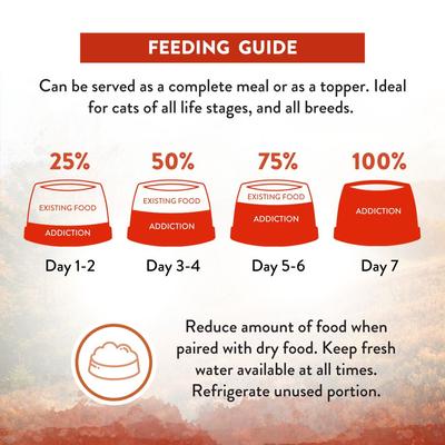 Mix increasing amounts of Addiction with decreasing amounts of the old food over 7 days. Reduce the amount of food given when paired with dry food