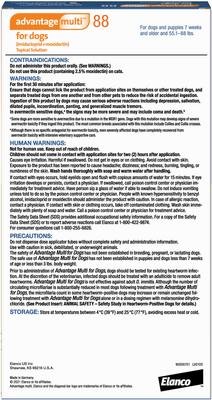 Do not dispense dose applicator tubes without complete safety and administration information. Use with caution in sick, debilitated, or underweight animals. The safety of Advantage Multi for Dogs has not been established in breeding, pregnant, or lactating dogs. The safe use of Advantage Multi for Dogs has not been established in puppies and dogs less than 7 weeks of age or less than 3 lbs. body weight. Prior to administration of Advantage Multi for Dogs, dogs should be tested for existing heartworm infection. At the discretion of the veterinarian, infected dogs should be treated with an adulticide to remove adult heartworms. The safety of Advantage Multi for Dogs has not been evaluated when administered on the same day as an adulticide. Advantage Multi for Dogs is not effective against adult D. Immitis.