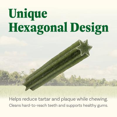 - The unique hexagonal shape supports dental hygiene by reducing plaque and tartar through natural chewing action, without the use of rawhide.