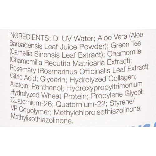Agua DI UV, Aloe vera (Jugo de hoja de Aloe Barbadensis en polvo), Té verde (Extracto de hoja de Camellia Sinensis), Manzanilla (Extracto de Chamomilla Recutita Matricaria), Romero (Extracto de hoja de Rosmarinus Officinalis), Ácido cítrico, Glicerina, Colágeno hidrolizado, Alantoína, Pantenol, proteína de trigo hidrolizada con hidroxipropiltrimonio, propilenglicol, quaternium-26, quaternium-22, copolímero de estireno/VP, metilcloroisotiazolinona, metilisotiazolinona.