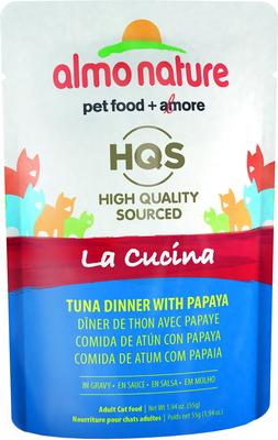 Your furry foodie will flip for Almo Nature’s HQS La Cucina Tuna Dinner with Sole Grain-Free Cat Food Pouches! Tender, flaked tuna with sole is cooked in its own broth to appeal to your little one’s senses while providing them with all the vitamins and minerals they need to thrive. This exclusive, highly digestible formula is designed with finicky felines in mind. Plus, Almo Nature HQS La Cucina comes in a variety of flavors to satisfy every palate—rotate your furry friend’s diet and provide them with a new, fresh feast every day! And you'll be happy to know that every bite is made with High Quality Sourced (HQS) ingredients—a term used to describe fish or meat that was once fit for human consumption but is now solely used for pet food to help nourish your furry friend!