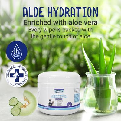 Say goodbye to itchy skin with Alpha Dog Series Chlorhexidine & Ketoconazole Scent Dog, Cat & Small Pet Wipes. These convenient, premoistened wipes are enriched with chlorhexidine, aloe, and other essential ingredients to keep your pet clean and comfortable between baths. Perfect for hot spots, allergies, rashes, acne, and superficial cuts, these medicated wipes help keep your pet's coat clean, fresh, and healthy while tackling the root causes of irritation and discomfort. Designed for ease of use, they're ideal for cleansing face folds, paws, and underarm areas, providing both purifying and hydrating care. Soothing aloe vera and a cucumber melon scent make each wipe a refreshing experience for your pet, too.