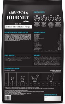 - American Journey Grain-Free Senior Salmon and Sweet Potato Recipe is made with salmon as the #1 ingredient, which provides amino acids to support lean muscles, energy and overall health.