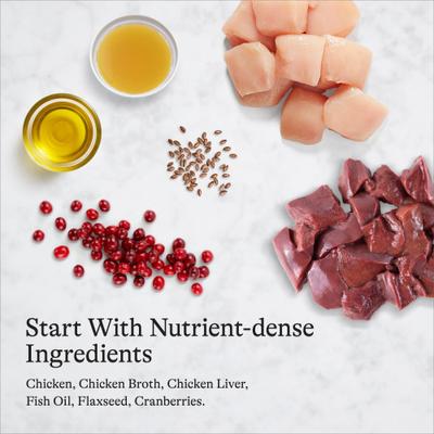 Chicken, Chicken Broth, Chicken Liver, Chicken Heart, Flaxseed Meal, Fish Oil (Preserved with Mixed Tocopherols), Sunflower Oil, Cranberries, Potassium Chloride, Cassia Gum, Xanthan Gum, Salt, Choline Chloride, Vitamins (Vitamin E Supplement, Thiamine Mononitrate, Niacin Supplement, d-Calcium Pantothenate, Pyridoxine Hydrochloride, Riboflavin Supplement, Vitamin A Supplement, Biotin, Vitamin D3 Supplement, Vitamin B12 Supplement, Folic Acid), Taurine, Inulin, Minerals (Ferrous Sulfate, Zinc Oxide, Copper Proteinate, Sodium Selenite, Manganese Sulfate, Potassium Iodide), Magnesium Sulfate.