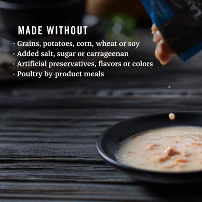 Indulge your cat with savory lickable broths from Landmark. Serve this recipe as a tasty, flavor-boosting topper for their everyday meals or on its own as a special, satisfying treat. No matter how you serve it, your cat will love the craveable protein from the bite-sized bits of salmon, the nutritious goodness of the tender tomatoes and kale and the silky texture of the broth. Moist, lickable recipes like this one not only please a cat’s sophisticated palate, they also supplement feline hydration with a little extra moisture too. So, while they enjoy their wholesome reward, they’ll also get a boost of hydration to help keep them happy and healthy. Delicious, nutritious and moisture-rich—Landmark lickable treats are just the pampering experience your cat deserves.
