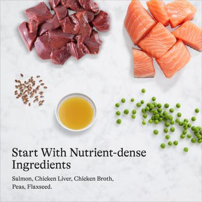 Salmon, Salmon Broth, Chicken (Source of Glucosamine & Chondroitin Sulfate), Chicken Liver, Chicken Broth, Ground Dried Peas, Chicken Heart, Powdered Cellulose, Dried Plain Beet Pulp, Pea Protein, Natural Flavor, Flaxseed Meal, Guar Gum, Minerals (Zinc Proteinate, Iron Proteinate, Copper Proteinate, Manganese Proteinate, Sodium Selenite, Potassium Iodide), Potassium Chloride, Vitamins (Thiamine Mononitrate, Vitamin E Supplement, Niacin Supplement, d-Calcium Pantothenate, Pyridoxine Hydrochloride, Riboflavin Supplement, Vitamin A Supplement, Biotin, Vitamin D3 Supplement, Vitamin B12 Supplement, Folic Acid), Taurine, Choline Chloride, Salt, Yucca Schidigera Extract, Carrageenan, L-Ascorbyl-2-Polyphosphate, L-Carnitine.