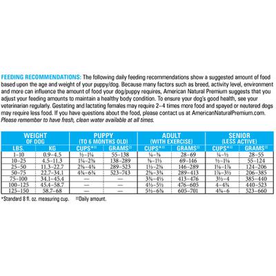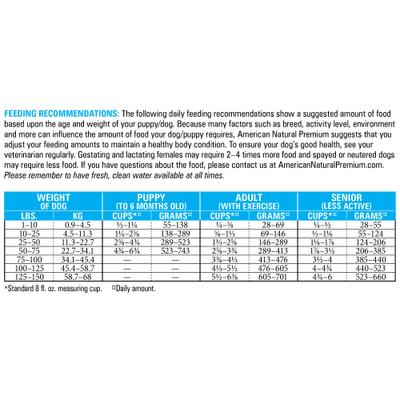 The following daily feeding recommendations show a suggested amount of food based upon the age and weight of your puppy/dog. Because many factors such as breed, activity level, environment and more can influence the amount of food your dog/puppy requires, American Natural Premium suggests that you adjust your feeding amounts to maintain a healthy body condition. To ensure your dog's good health, see your veterinarian regularly. Gestating and lactating femals may require 2-4 times more food and spayed or neutered dogs may require less food.