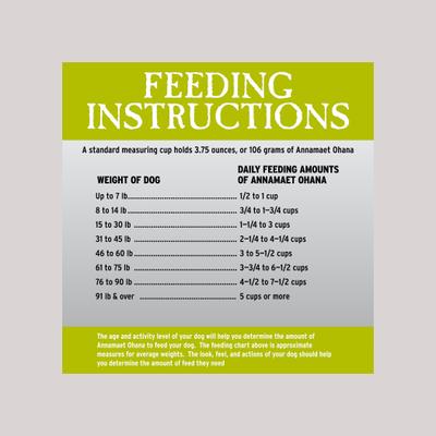 The age and activity level of your dog will help you determine the amount of Annamaet Ohana Puppy to feed your dog. The feeding chart below is approximate daily measures for average weights. The look, feel and actions of your dog should help you determine the amount of feed they need.