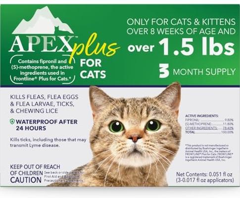 Protect your favorite feline from pesky fleas and ticks with Apex Plus Topical Flea & Tick Treatment for Cats. It’s specifically formulated for cats weighing more than 1.5 pounds, providing precise, effective protection. This flea and tick treatment not only kills adult fleas, but also targets flea eggs and larvae, preventing the development of flea pupae. It features a combination of Fipronil and (S)-methoprene that works synergistically to attack the nervous systems of fleas and ticks, while inhibiting the maturation of flea eggs and larvae—effectively breaking the flea life cycle. Plus, it’s easy to apply, and one monthly application provides 30 days of continuous protection against fleas, ticks, and chewing lice. Designed to become waterproof just 24 hours after application, this super convenient formula continues to work effectively even if your kitty gets wet.