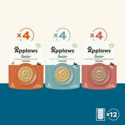 Feed your cat’s curious mind and adventurous appetite with Applaws Senior Variety Selection Grain-Free Mousse Wet Cat Food. Your cat’s tastes are constantly evolving—that's why Applaws offers a variety of naturally delicious wet cat food options. Each recipe is crafted with high-quality, limited ingredients to ensure your cat gets the very best in nutrition and flavor. Premium proteins are mixed with complex carbohydrates to fuel your feline’s day. Serve this soft food as a complement to any Applaws dry cat food (sold separately) for a complete and balanced diet that keeps your kitty on their toes.
