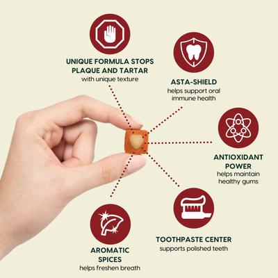 - Delivers 5 benefits in 1 chew—it cleans teeth, has a refreshing toothpaste center, removes plaque and tartar and freshens breath.