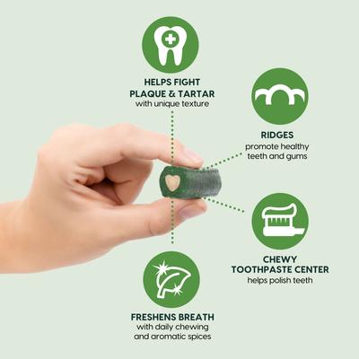 - The chewy toothpaste center helps polish your pup’s teeth.