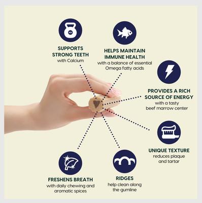 - Features calcium, omega fatty acids, and a beef marrow center for added benefits.