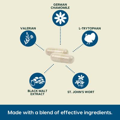 - Contains natural ingredients including L-tryptophan, St. John’s Wort, German chamomile and valerian.