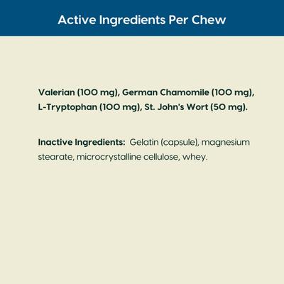 Valerian, German Chamomile, L-Tryptophan, St. Johns Wort, Gelatin (Capsule), Magnesium Stearate, Microcrystalline Cellulose, Whey.