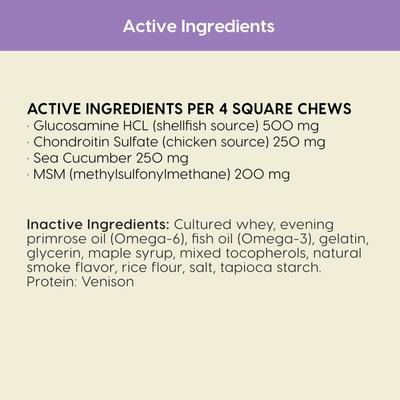 Chondroitin Sulfate, Cultured Whey, Evening Primrose Oil (Omega-6), Fish Oil (Omega-3), Gelatin, Glucosamine HCL, Glycerin, Maple Syrup, Mixed Tocopherols, MSM, Natural Smoke Flavor, Rice Flour, Salt, Sea Cucumber,Tapioca Starch, Venison.