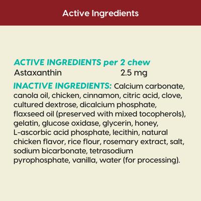 Active Ingredients per 2 chews: Astaxanthin 2.5 mg; Ingredients: Calcium carbonate, canola oil, chicken, cinnamon, citric acid, clove, cultured dextrose, dicalcium phosphate, flaxseed oil (preserved with mixed tocopherols), gelatin, glucose oxidase, glycerin, honey, L-ascorbic acid phosphate, lecithin, natural chicken flavor, rice flour, rosemary extract, salt, sodium bicarbonate, tetrasodium pyrophosphate, vanilla, water (for processing).