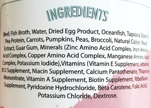 Beef, Fish Broth, Water, Dried Egg Product, Oceanfish, Tapioca Starch, Pea Protein, Carrots, Pumpkins, Peas, Broccoli, Natural Color, Yeast Extract, Guar Gum, Minerals (Zinc Amino Acid Complex, Iron Amino Acid Complex, Copper Amino Acid Complex, Manganese Amino Acid Complex, Potassium Iodide),Vitamins (Vitamin E Supplement, Vitamin B12 Supplement, Niacin Supplement, Calcium Pantothenate, Thiamine Mononitrate, Vitamin A Supplement, Biotin Supplement, Riboflavin Supplement, Pyridoxine Hydrochloride, Beta Carotene, Folic Acid), Potassium Chloride, Dextrose.