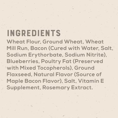 Harina de trigo, trigo molido, trigo molido, tocino (curado con agua, sal, eritorbato de sodio, nitrito de sodio), arándanos, grasa de ave (conservada con tocoferoles mixtos), linaza molida, saborizante natural (fuente de sabor a tocino de arce), sal, suplemento de vitamina E, extracto de romero.