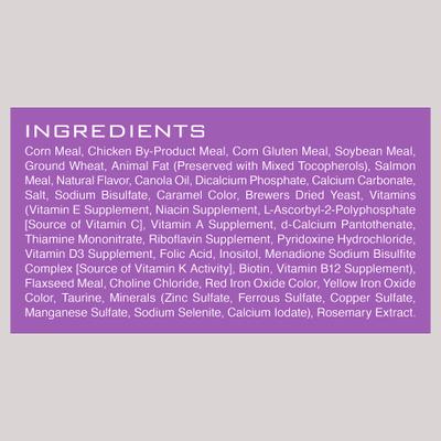 Ground Yellow Corn, Chicken By-Product Meal, Corn Gluten Meal, Soybean Meal, Ground Wheat, Chicken Fat (Preserved with mixed tocopherols), Salmon Meal, Animal Digest, Canola Oil, Dicalcium Phosphate, Calcium Carbonate, Salt, Sodium Bisulfate, Vitamins (Choline Chloride, Vitamin E Supplement, Niacin Supplement, Ascorbic Acid, Vitamin A Supplement, Pantothenic Acid, Thiamine Mononitrate, Riboflavin Supplement, Pyridoxine Hydrochloride, Folic Acid, Biotin, Vitamin B12 Supplement, Inositol, Menadione Sodium Bisulfite Complex), Brewers Dried Yeast, Flaxseed Meal, Caramel Color, Minerals (Zinc Sulfate, Ferrous Sulfate, Copper Sulfate, Manganese Sulfate, Sodium Selenite, Calcium Iodate), Taurine, Red Iron Oxide, Yellow Iron Oxide, Lecithin, Rosemary Extract.