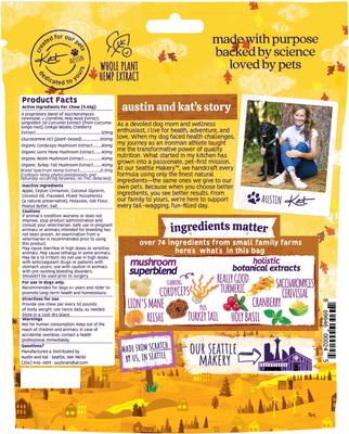 Pet parents, give your senior dogs the gift of healthy aging with Austin and Kat Brady’s All-in-1 Senior Support 14mg Broad Spectrum Hemp Chews Supplement for Dogs. Designed for dogs ages 6 and above, this supplement is specially formulated with a curated collection of botanicals known to support immune system, cognition, circulation, and occasional stiffness and soreness. With powerful antioxidants like sustainably sourced ginkgo biloba, turmeric curcumin, and a mushroom extract superblend, along with broad spectrum hemp, your furry friend can make the most of their golden years. Plus, these chews are made in small batches with responsibly sourced ingredients by a 100% employee-owned business in Seattle. And this supplement is also available in an oil form (sold separately).