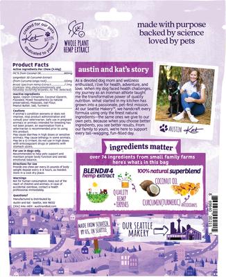 Introduce your furry friend to the calming benefits of Austin and Kat Calming 5mg Broad Spectrum Hemp Chews Supplement for Dogs. These award-winning soft chews are crafted with real apple and peanut butter and packed with powerful botanical ingredients for an antioxidant boost. Each chew contains 5 milligrams of premium broad-spectrum hemp, making them ideal for small and medium dogs. They are also enriched with Longvida Optimized Curcumin, a potent extract of turmeric. Along with helping to calm and relax pets they chews help to balance inflammatory pathways, supporting proper body function and homeostasis. Plus, they are made in small batches with responsibly sourced ingredients by a 100% employee-owned business in Seattle, using responsibly sourced ingredients.