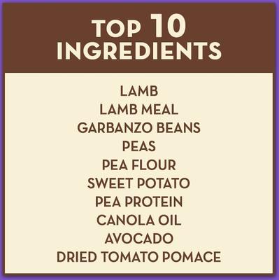 Lamb, Lamb Meal, Peas, Garbanzo Beans, Pea Flour, Pea Protein, Canola Oil (Preserved with Mixed Tocopherols), Avocado, Dried Tomato Pomace, Sweet Potato, Natural Flavor, Pea Fiber, Dried Chicory Root, Potassium Chloride, Salt, Kelp Meal, Avocado Oil, Vitamins (Choline Chloride, a-Tocopherol Acetate (Source of Vitamin E), L-Ascorbyl-2-Polyphosphate (Source of Vitamin C), Niacin, Biotin, Calcium Pantothenate, Vitamin A Supplement, Riboflavin Supplement, Pyridoxine Hydrochloride (Source of Vitamin B6), Thiamine Mononitrate (Source of Vitamin B1), Vitamin B12 Supplement, Vitamin D3 Supplement, Folic Acid), Taurine, Minerals (Zinc Sulfate, Ferrous Sulfate, Iron Amino Acid Chelate, Zinc Amino Acid Chelate, Selenium Yeast, Copper Amino Acid Chelate, Copper Sulfate, Manganese Sulfate, Manganese Amino Acid Chelate, Calcium Iodate), Rosemary Extract, Sage Extract, Pineapple Stem, Papaya Extract, Dehydrated Lactobacillus Acidophilus Fermentation Product, Dehydrated Lactobacillus Casei Fermentation Product, Dehydrated Bifidobacterium Thermophilum Fermentation Product, Dehydrated Enterococcus Faecium Fermentation Product.