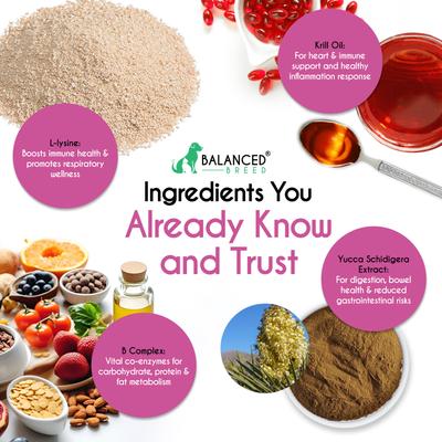 Active Ingredients Per Chew: L-Lysine Hcl 200 mg, Krill Oil 25 mg, Yucca Schidigera Extract 20 mg, Folic Acid 0.1 mg, Vitamin B12 0.005 mg.