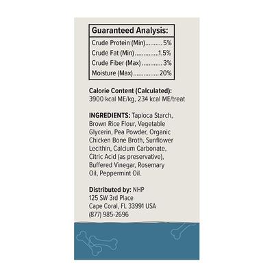 Tapioca Starch, Brown Rice Flour, Vegetable Glycerin, Pea Powder, Sunflower Lecithin, Calcium Carbonate, Citric Acid, Organic Chicken Bone Broth, Buffered Vinegar, Rosemary (Leaf) Oil, Peppermint (Leaf) Oil.