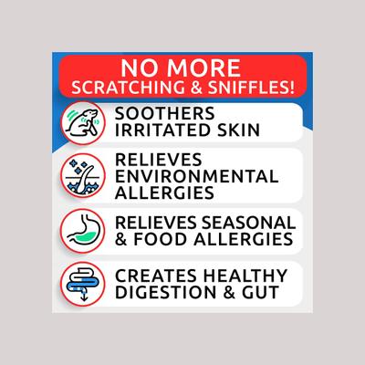 - Helps alleviate allergy symptoms like paw licking, itching, chewing, scratching, irritation, bald spots, and hot spots.