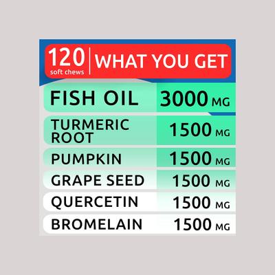 Active Ingredients: Omega-3 Fatty Acids (Fish Oil), Turmeric Root, Grape Seed Extract, Quercetin, Pumpkin Powder, Bromelain, EPA (Eicosapentaenoic Acid), DHA (Docosahexaenoic Acid). Omega-3 Fatty Acids (Fish Oil), Turmeric Root, Grape Seed Extract,Quercetin, Pumpkin Powder, Bromelain, EPA (Eicosapentaenoic Acid), DHA (Docosahexaenoic Acid). Omega-3 Fatty Acids (Fish Oil), Turmeric Root, Grape Seed Extract, Quercetin, Pumpkin Powder, Bromelain, EPA (Eicosapentaenoic Acid), DHA (Docosahexaenoic Acid).