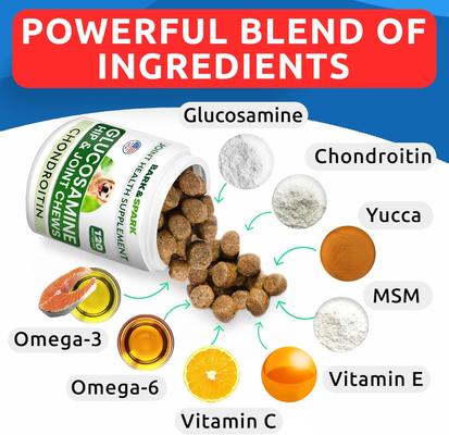 - Comprehensive blend of glucosamine, chondroitin, MSM, yucca, and omega fatty acids helps alleviate pain and discomfort caused by aging, inflammation, and hip dysplasia.