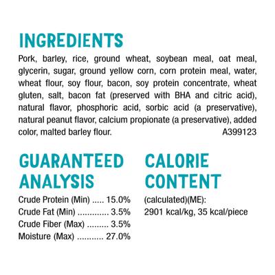Pork, Barley, Rice, Ground Wheat, Soybean Meal, Oat Meal, Glycerin, Sugar, Ground Yellow Corn, Corn Protein Meal, Water, Wheat Flour, Soy Flour, Bacon, Soy Protein Concentrate, Wheat Gluten, Salt, Bacon Fat (Preserved With Bha And Citric Acid), Natural Flavor, Phosphoric Acid, Sorbic Acid (A Preservative), Natural Peanut Flavor, Calcium Propionate (A Preservative), Added Color, Malted Barley Flour. A399123.
