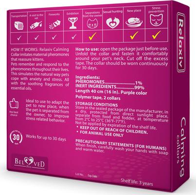 Este collar proporciona tranquilidad las 24 horas del día, los 7 días de la semana, para ayudar a tu gato a sentirse tranquilo, cómodo y relajado. Si tu gato orina en la caja de arena, araña u orina afuera, puedes usar el collar calmante Relaxivet. Este collar se puede usar tanto en interiores como en exteriores y debe usarse las 24 horas del día para tranquilizar a tu gato.