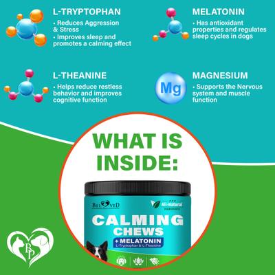 - These chews are made with valerian root, chamomile, and L-tryptophan, providing natural calming ingredients to help your pup relax.