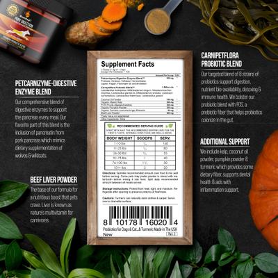 Active Ingredients: (Per 1 Scoop) Organic Coconut Oil,DigeSEB Super Pet (Portease, Amylase, Cellulase, Hemicelluase, Lipase, Papain, and Bromelain), Atlantic Kelp, FOS (fructo-oligosaccharides), Organic Pumpkin Powder, Organic Turmeric, Probiotic Blend 5 Billion CFU, (Lactobacillus Acidophilus, Lactobacillus Plantarum, Lactobacillus Casei, Bifidobacterium Longum, Lactobacillus Brevis, Streptococcus Thermophilus, Bifidobacterium animalis).