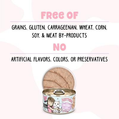 Give your growing kitten the nutrition she needs with BFF Kitten Cute to Boot Wet Cat Food. This delicious chicken recipe is formulated to support your kitten's physical and mental health. It contains high-quality proteins, excellent nutrition, and high moisture content. Plus, it is free of grain, gluten, and carrageenan. You won't find any artificial colors or preservatives either. Produced in human food facilities, this recipe is sure to keep pet parents happy and support kittens as they grow healthy and strong.