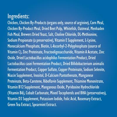 Chicken, Chicken By-Products (organs only, source of arginine), Corn Meal, Chicken By-Product Meal, Dried Beet Pulp, Whitefish, Oatmeal, Menhaden Fish Meal, Brewers Dried Yeast, Salt, Choline Chloride, DL-Methionine, Sodium Propionate (a preservative), Vitamin E Supplement, L-Lysine, Monocalcium Phosphate, Biotin, L-Ascorbyl-2-Polyphosphate (source of Vitamin C), Zinc Proteinate, Fructooligosaccharide, Vitamin A Acetate, Zinc Oxide, Dried Lactobacillus acidophilus Fermentation Product, Dried Lactobacillus casei Fermentation Product, Dried Bifidobacterium animalis Fermentation Product, Copper Sulfate, Copper Proteinate, Sodium Selenite, Niacin Supplement, Inositol, D-Calcium Pantothenate, Manganese Proteinate, Beta-Carotene, Riboflavin Supplement, Thiamine Mononitrate, Vitamin B12 Supplement, Manganous Oxide, Pyridoxine Hydrochloride (Vitamin B6), Cobalt Carbonate, Mixed Tocopherols and BHA (preservatives), Vitamin D3 Supplement, Potassium Iodide, Folic Acid, Rosemary Extract, Green Tea Extract, Spearmint Extract.