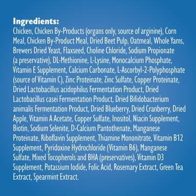 Chicken, Chicken By-Products (organs only, source of arginine), Corn Meal, Chicken By-Product Meal, Dried Beet Pulp, Oatmeal, Whole Yams, Brewers Dried Yeast, Flaxseed, Choline Chloride, Sodium Propionate (a preservative), DL-Methionine, L-Lysine, Monocalcium Phosphate, Vitamin E Supplement, Calcium Carbonate, L-Ascorbyl-2-Polyphosphate (source of Vitamin C), Zinc Proteinate, Zinc Oxide, Copper Proteinate, Dried Lactobacillus acidophilus Fermentation Product, Dried Lactobacillus casei Fermentation Product, Dried Bifidobacterium animalis Fermentation Product, Dried Blueberry, Dried Cranberry, Dried Apple, Vitamin A Acetate, Copper Sulfate, Inositol, Niacin Supplement, Biotin, Sodium Selenite, D-Calcium Pantothenate, Manganese Proteinate, Riboflavin Supplement, Thiamine Mononitrate, Vitamin B12 Supplement, Pyridoxine Hydrochloride (Vitamin B6), Manganous Oxide, Cobalt Carbonate, Mixed Tocopherols and BHA (preservatives), Vitamin D3 Supplement, Potassium Iodide, Folic Acid, Rosemary Extract, Green Tea Extract, Spearmint Extract.
